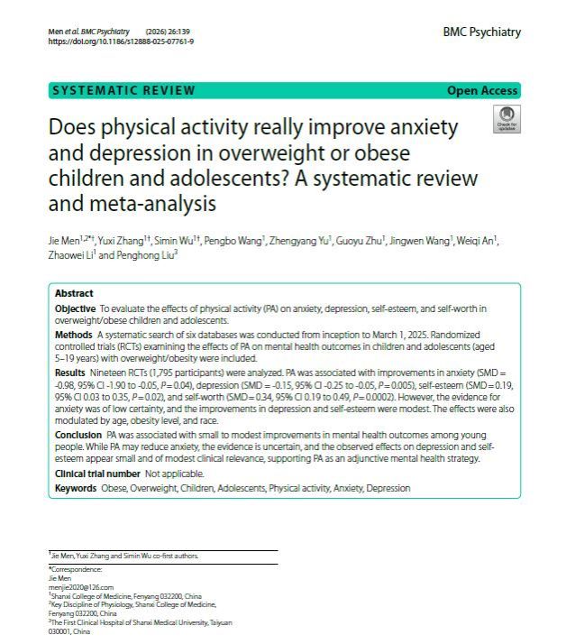 近日,我校临床医学专业2022级本科生张郁茜、武思敏作为共同第一作者,在精神病学领域国际知名期刊BMC Psychiatry(JCR一区SSCI期刊,中科院二区期刊,IF:3.6)发表题为“Does physical activity really improve anxiety and depression in overweight or obese children and adolescents? A systematic review and meta-analysis”的研究论文)。该研究基于1795例临床样本,全面分析了身体活动对肥胖儿童青少年焦虑、抑郁的改善效果,为其作为辅助心理干预手段提供了科学证据支持。
