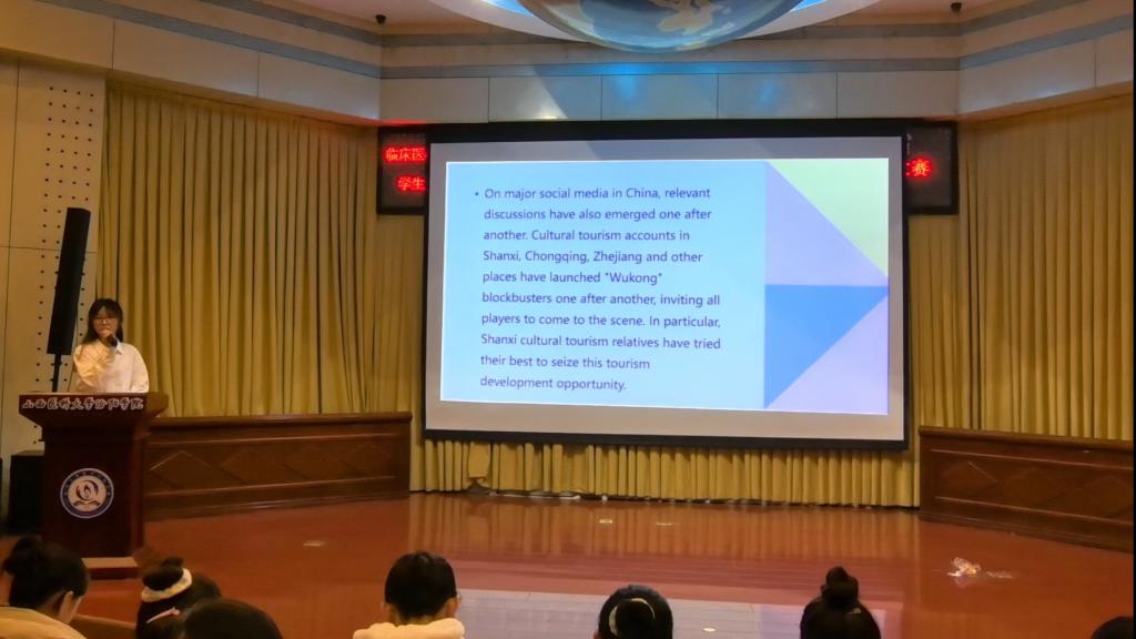 决赛参赛对象为初赛中成绩优异的8位选手。我校团委书记王建荣老师、临床医学系党总支书记贾爱萍老师、临床医学系党总支副书记郭晋老师、临床医学系团委书记刘峰老师、2024班辅导员常丽俊老师出席,评委老师有英语教研室冀新艳、梁璇、王恒花、王晓华、任佳禹5位老师。 第一轮由8位选手分别讲述《黑神话·悟空》对山西文旅的影响、发展以及对山西文旅的启示。第二轮选手围绕“passion”所代表的激情和热情展开,探讨热情在个人成长和发展中的重要性。中场由系文体部成员带来舞蹈《爱的主打歌》,给激烈的比赛带来活跃舒缓的气氛,选手紧张的心情得到缓解。第三轮选手进行英语配音,其配音生动而又标准,融入了故事情节。第四轮选手表演了优美的英文诗歌朗诵,令人沉浸。每轮结束由五位评审老师打分。最后有两位选手获得并列第一的好成绩。