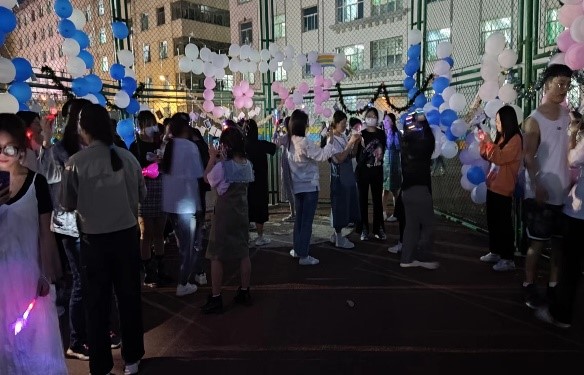 在新闻传媒中心各位成员的用心准备下,活动现场布置的十分梦幻,一串串气球挂在绿色网面上,点缀着漂亮的彩灯,还有泡泡在空中飞舞,在夜色中展现得无比浪漫。活动内容也十分有趣,最受欢迎的当属在明信片上写下自己的三行情书,用漂亮的丝带系在网面上,让心中的浓烈的情感在简练的语言中展现。许多同学还表达了对党,对国家的热爱,文笔优秀,情感真挚,令人感同身受。还有许愿瓶活动也十分有趣,同学们将自己的心中的愿望写在精美的便签纸上,在这个特殊的夜晚等待一份惊喜。有些同学还参与了点歌活动,美妙的歌声让这夜晚更添色彩。活动中场系舞团为大家准备了舞蹈,让现场气氛走向高潮,一片叫好声展现了大家的热情。最后的获奖者不仅获得了礼品还和我们的吉祥物拍照留念。活动落下帷幕,大家都带着今晚美好的回忆缓缓离场,开心又不舍。