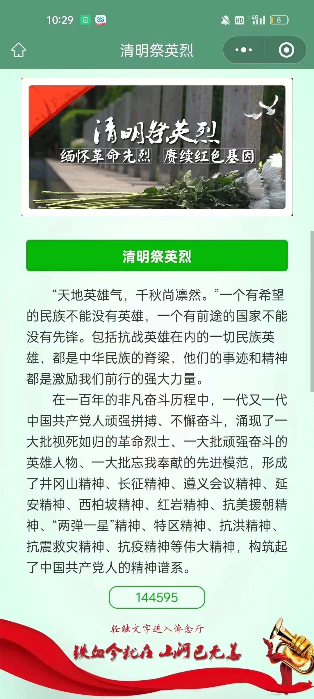 应校团委要求,本班通过网上祭英烈的形式对英烈进行祭奠。922班的同学怀着崇敬的心情,通过国家公祭网、中华英烈网等官方网站开展线上祭奠英烈活动,以默哀、敬献花篮,点亮蜡烛、敲响祭钟等多种形式,祭奠英烈英灵,颂扬英烈丰功伟绩。