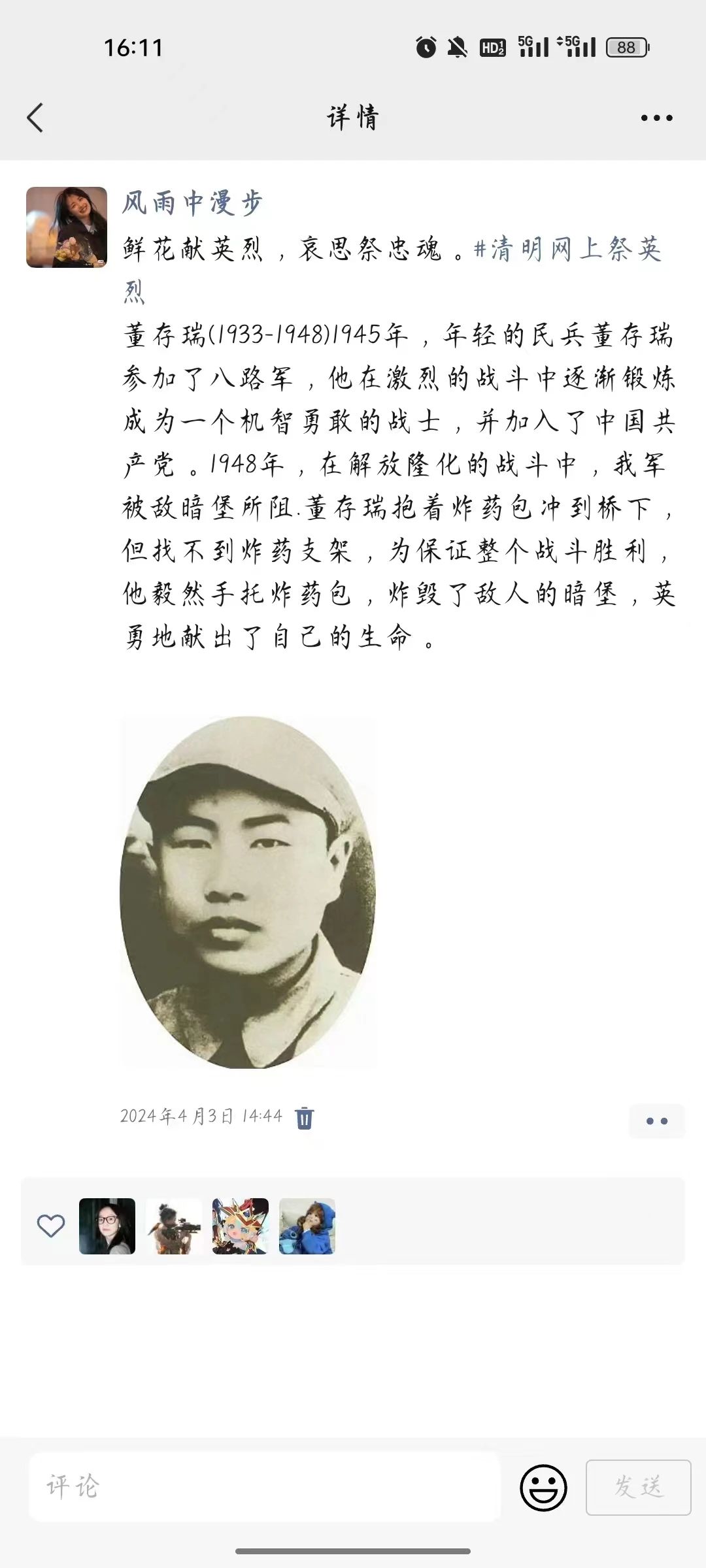 李家乐、秦欣冉和王婷苒三位同学带领全班同学来到了汾阳市烈士陵园为革命烈士默哀以及敬献菊花;刘芷含、赵淑丽和许潇然等同学摘抄了红色诗篇《不朽》等经典著作;杨子叶、柴瑞瑞和付亚彤等同学参加了网上祭英烈的活动。 通过网上为英烈献花,同学们进一步了解了各位英烈为国家所做的贡献,理解了他们坚强不屈的精神;最后,同学们在团支书的带领下聆听革命故事,了解了许多英雄的伟大事迹。此次讲述向同学们宣传了革命烈士为民族独立和解放、为国家繁荣立下的丰功伟绩;让他们学习了革命烈士坚贞不屈、百折不挠、不畏强暴的民族气节和坚持真理,无私奉献的优秀品质。缅怀革命先烈、追思前辈圣贤、感受文化魅力,铭记历史,珍惜现在,开创未来。
