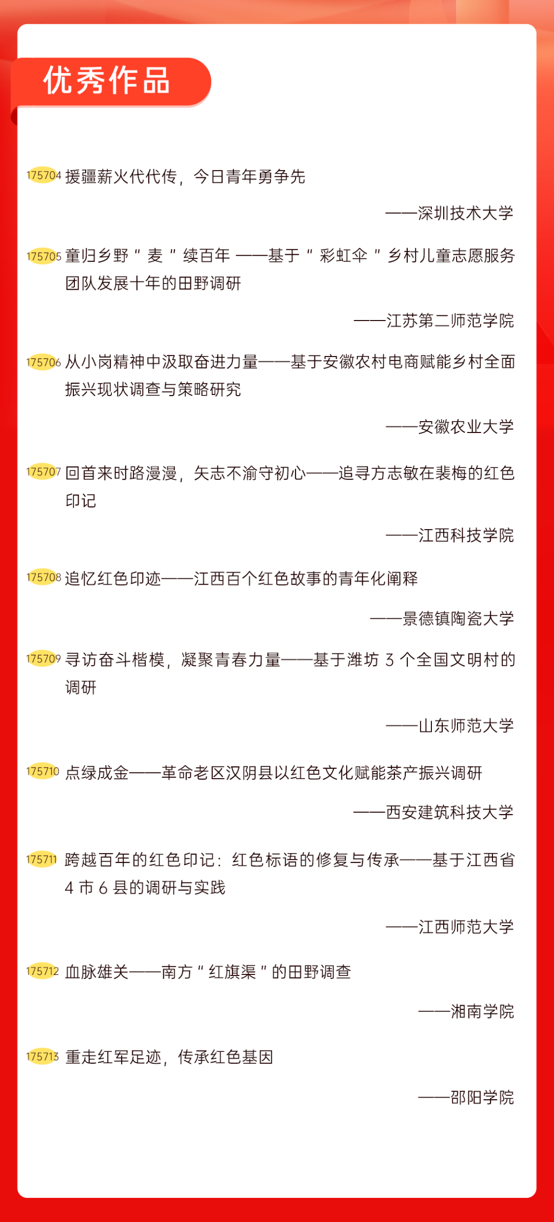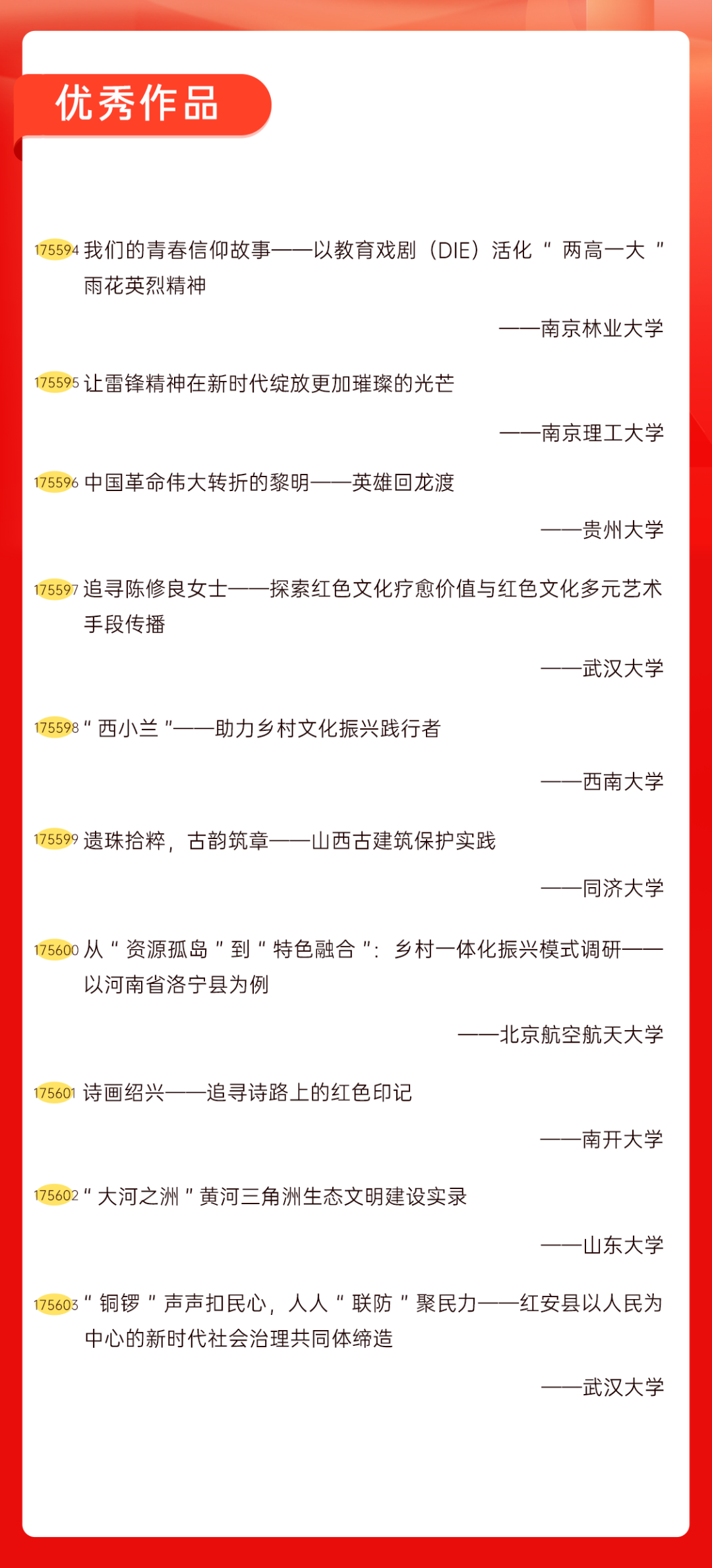 为增加广大青年互动式学习和交流,让青年学生的实践成果形成更广泛的社会影响,辐射带动更多青年学生突破空间限制、感受朋辈风采、传承红色基因,组委会将部分优秀作品建成红色教育的云上“红色课堂”。