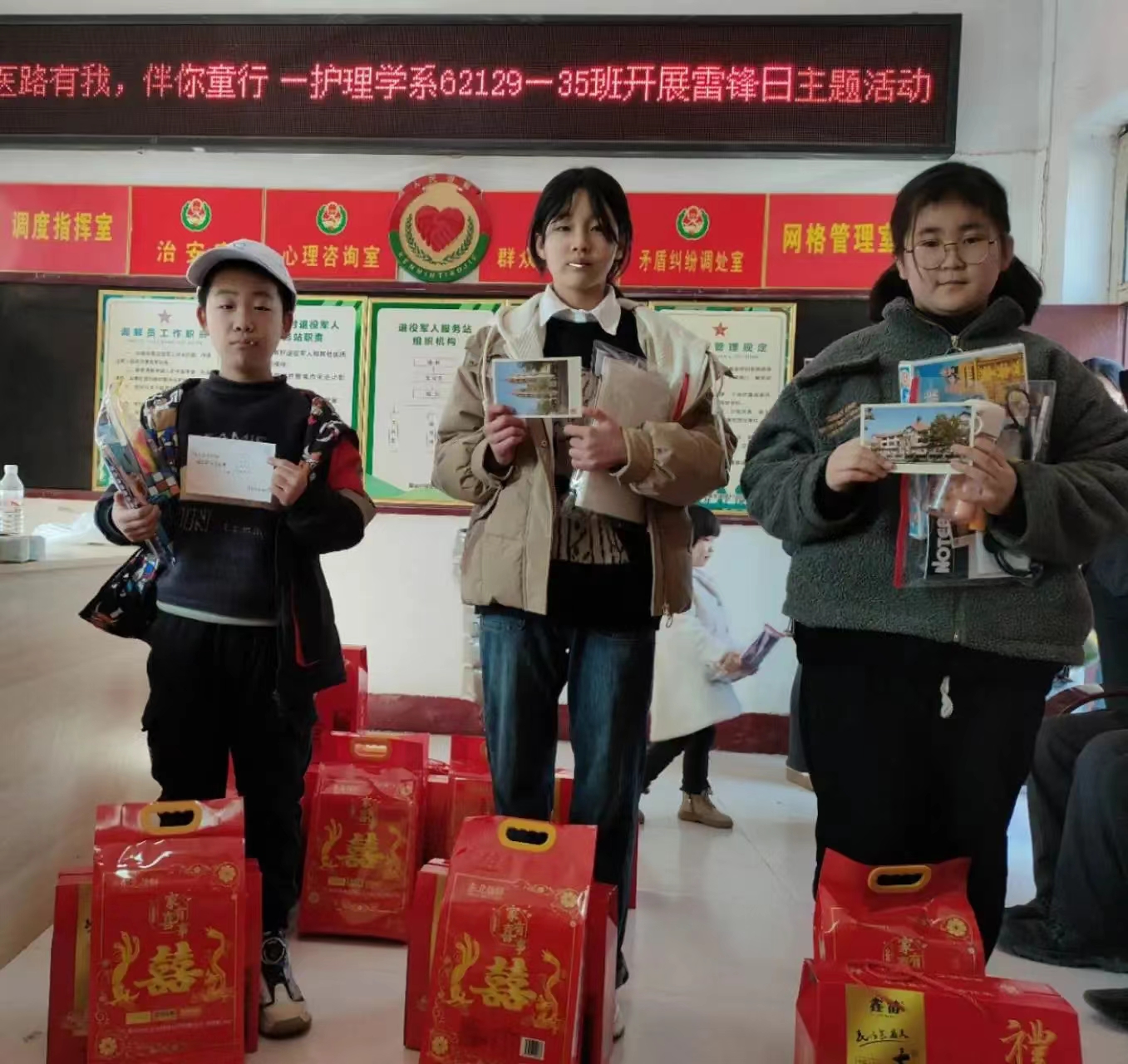 为传承和弘扬雷锋精神,传承中华民族尊老爱幼的优良传统,同学们自发组织了爱心捐助活动,为张家堡村的13名留守儿童送去春日温情。同学们根据不同学龄段,将精心挑选的文具图书和慰问物品分发给孩子们,并陪伴孩子们一起做手工、玩游戏,重温《雷锋日记》,将传递着祝福与希望的爱心明信片送给孩子们,活动现场充满欢声笑语,孩子们脸上洋溢着开心的笑容,为初春增添浓浓暖意。