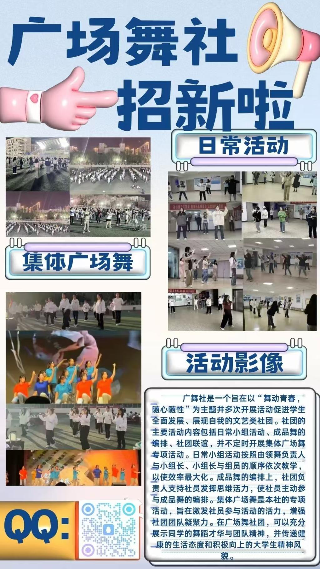 广场舞社是一个旨在以“舞动青春,随心随性”为主题多次开展活动促进学生全面发展、展现自我的文艺类社团。社团的主要活动内容包括日常小组活动、成品舞的编排、社团联谊,并不定时开展集体广场舞专项活动。在广场舞社团,可以充分展示同学的舞蹈才华与团队精神,并传递健康的生活态度和积极向上的大学生精神风貌。