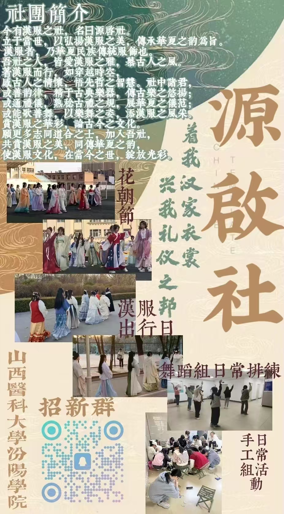 源启社,让你的古风梦想成为现实!在这里,你可以与朋友一起探讨汉服的魅力,参加各类活动,如传统服饰走秀及讲解、传统礼仪普及、传统乐器表演、传统发饰及刺绣团扇的制作、传统舞蹈学习,古风妆造学习,还会组织国风游戏。通过社团活动,增强大家对传统文化的认同感和自豪感,为传承中华民族优秀传统文化贡献一份力量。