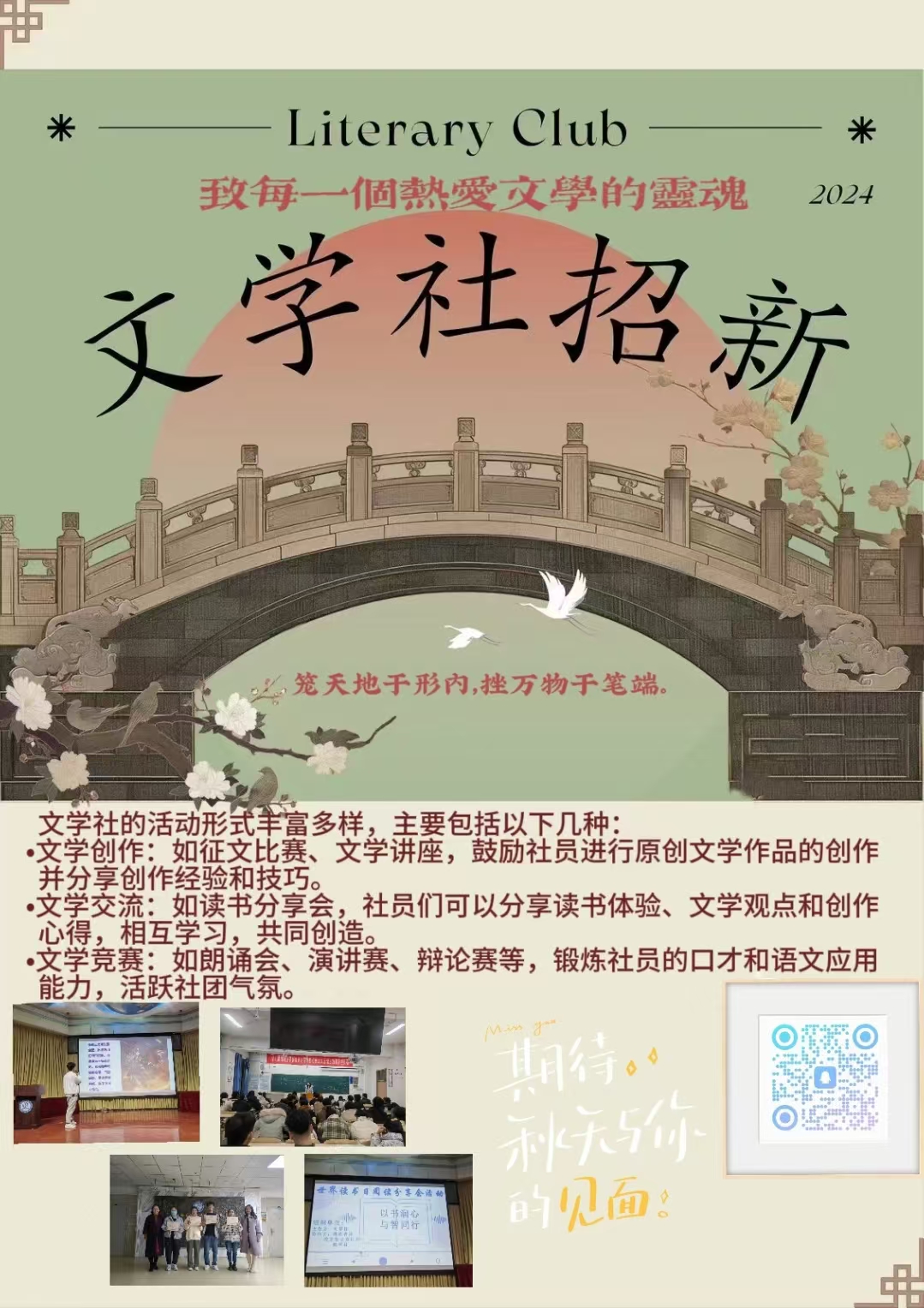 在这个创意无限、灵感涌动的时代,文学社诚挚邀请每一位热爱文字、渴望用笔尖描绘心灵世界的你,加入我们的大家庭。在这里,每一颗对文学怀抱热忱的心灵都将找到归宿,每一次灵感的闪现都将被珍视和培育。