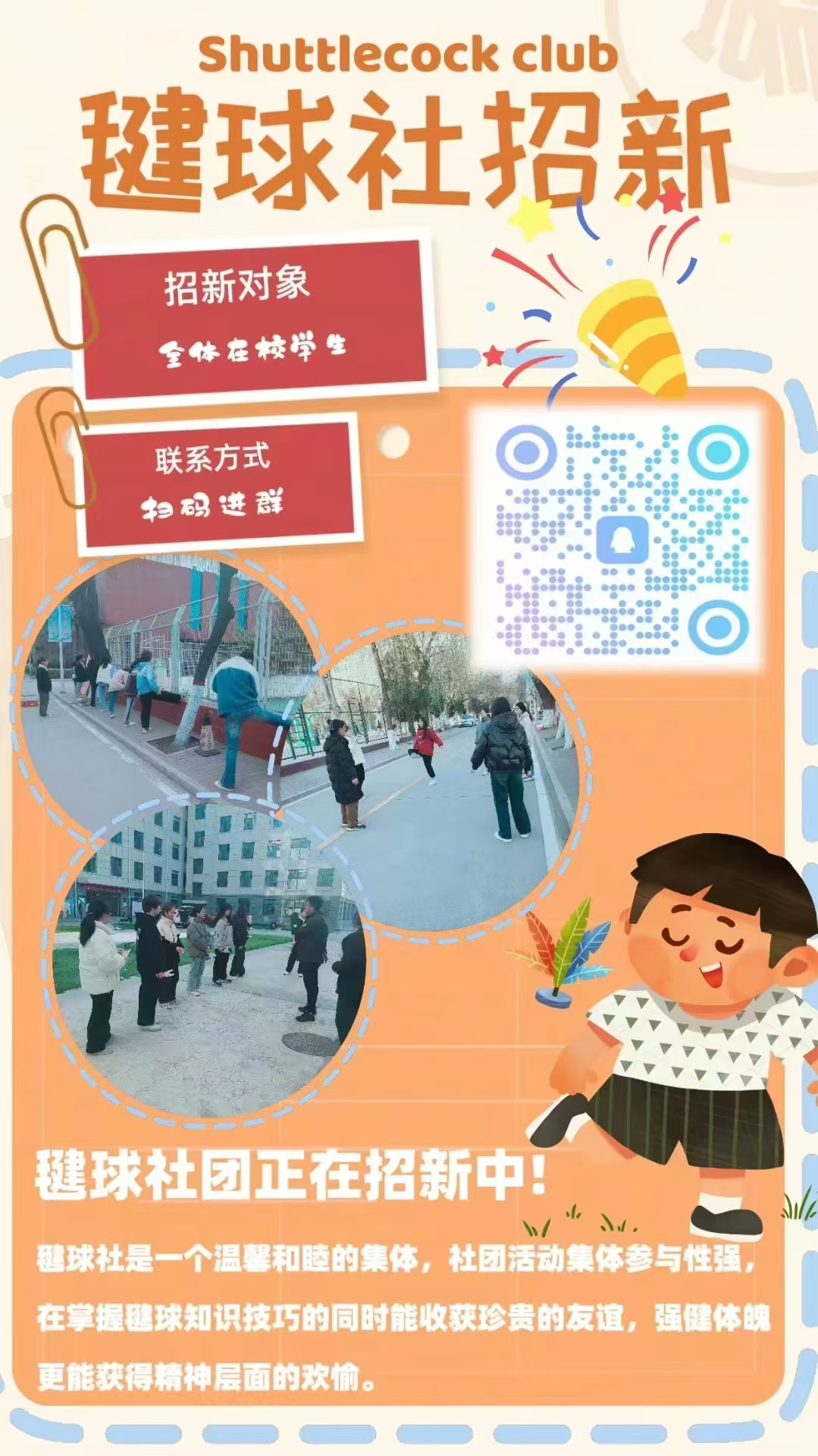毽球是一项古老的竞技游戏,它易学易懂,集体参与性强,学习毽球能够锻炼身体素质,培养团队协作精神,有利于学生形成积极向上的兴趣爱好,在毽球社你可以学到毽球知识技巧,掌握专业技能,能够深刻体会到毽球的魅力和快乐,将会收获更多锻炼自己的机会。