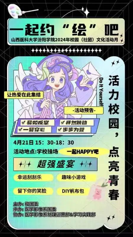 "春风含笑柳如烟,正是人间四月天。"天气转暖,扑面而来的春风,吹皱了湖面,吹开了花朵,唤醒了生灵,万物复苏,让人感受到了无限的希望与活力,丰富多彩的活动也如约而至,为了激发学生创新思维能力,展现学生艺术才华,营造校园文化艺术氛围。医学影像系学生会新媒运营部及学习实践部特此策划了一场别开生面的活动——一起约“绘”吧!现将有关事项通知如下:
