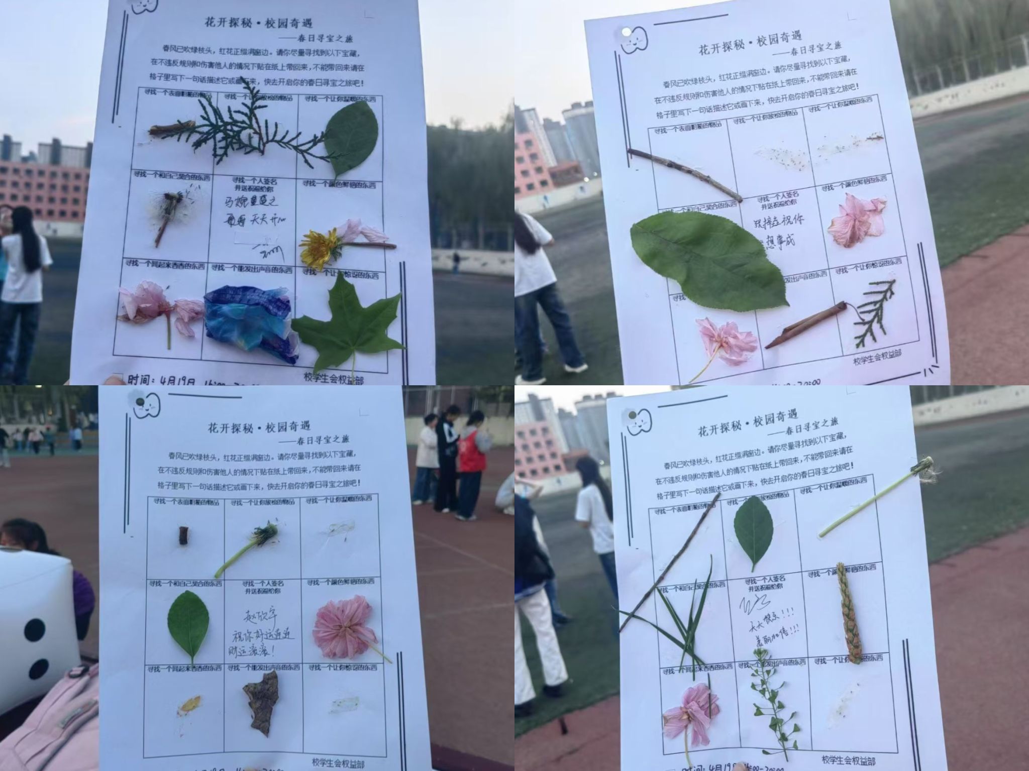 以“春”为题,探寻校园。一纸九宫格引得大家穿梭在校园各个角落,寻找春天的踪迹。无论是树梢上的绿叶,还是不慎跌落的花朵都被大家定格下来。在寻春的过程中,感受着大自然的神奇,也感慨着校园时光的快乐,为活动增添了一抹绚丽的春日色彩。