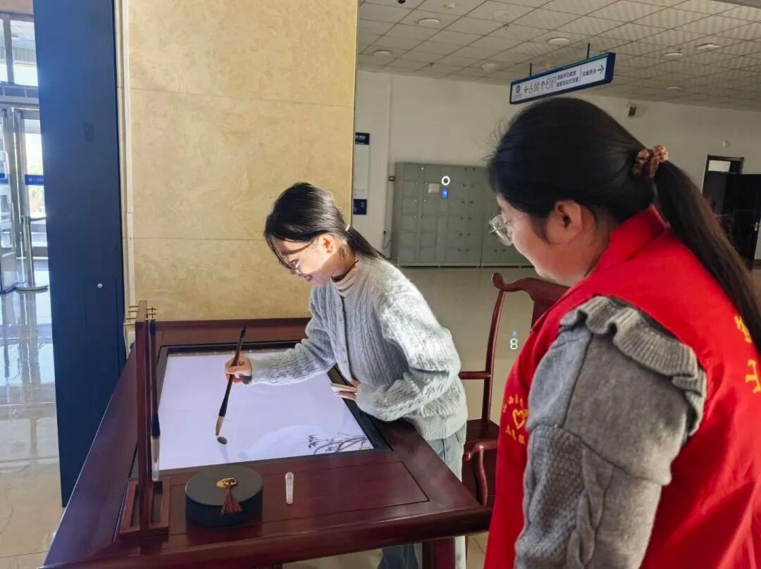 在孝义校区,志愿者则重点带领汾阳校区的同学们熟悉图书馆和校园环境。走进图书馆,同学们在AI写字板上亲身体验,直观感受科技赋能的魅力;漫步校园,同学们在校园导览图前,领略校园全景,精准定位图书馆、教学楼、实验楼等核心区域。