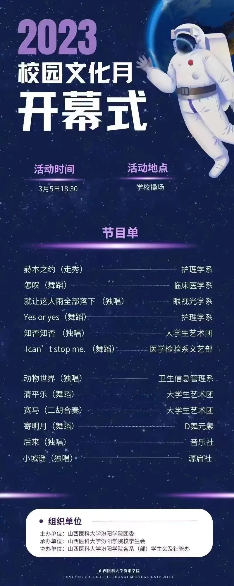 为认真贯彻落实党的二十大精神,坚持以习近平新时代中国特色社会主义思想为指导,号召我校广大青年学生深入学习习近平总书记在庆祝中国共青团成立100周年大会上的讲话精神,不断增强政治性、先进性、群众性,着力提升组织力、引领力、服务力,团结引领广大青年进一步增强“四个意识”、坚定“四个自信”、坚决做到“两个维护”,充分展现我校学子积极向上的精神风貌,不断推动校园文化阵地建设,进一步促进大学生社会主义核心价值观的养成,我校团委决定举办以“挥别旧时光,奋进新征程”为主题的文化月活动,由学生会、学生社团、各系部分团委联合承办。