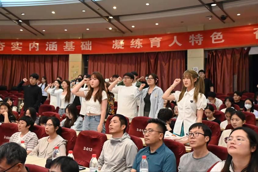 最后一个环节是心理委员宣誓。领誓人杨佳欣同学带领全体心理委员宣誓,大家都举起右手进行了庄严宣誓。