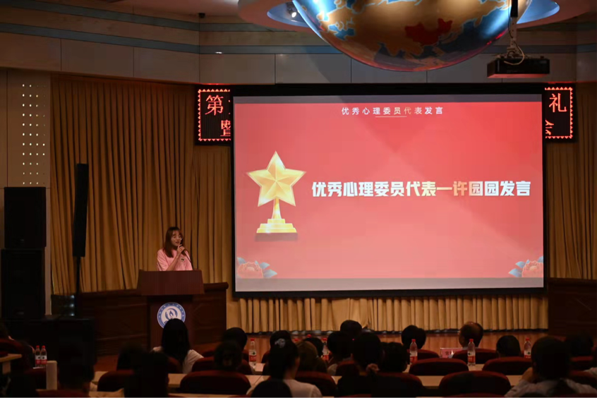 第三个环节,优秀心理委员代表许园园发言。她讲述了自己在过去一年中参与的心联会工作以及从中收获的成长与经验。