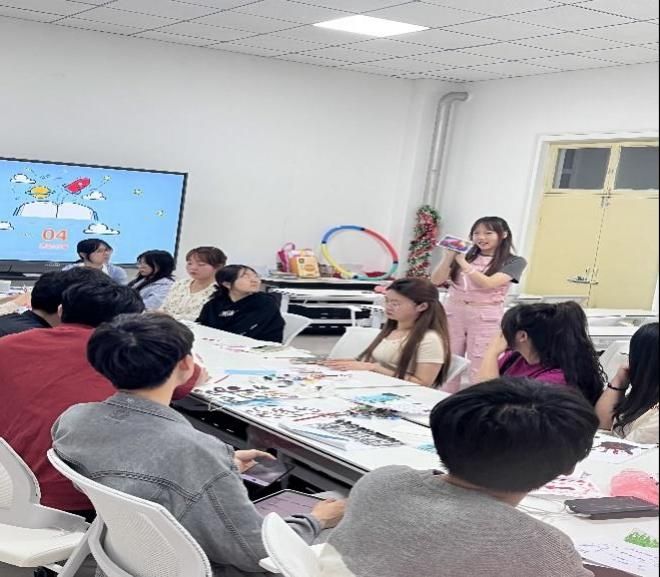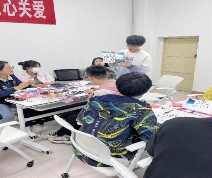 涂鸦完成后,进入活动分享阶段,分为组内分享和个人分享。各小组内就色彩、构图等进行了组内分享。小组成员分享了自己的创作想法和对自己的期望,让每个人的感受和想法被看见、被倾听、被理解,并获得支持。之后,每个小组选出一位成员对自己的涂鸦作品进行个人分享。