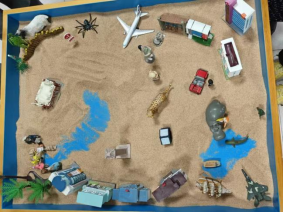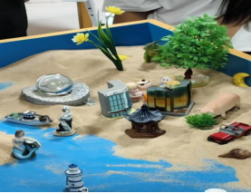 第三步,赵老师简要介绍了沙盘活动的内容及规则,摸沙体验结束后进入沙盘创作环节,创作结束后,同学们组内分享了自己摆放沙具的意图、感受。赵老师通过投射性提问引发同学们跳出框架,感知象征背后的情感流动。