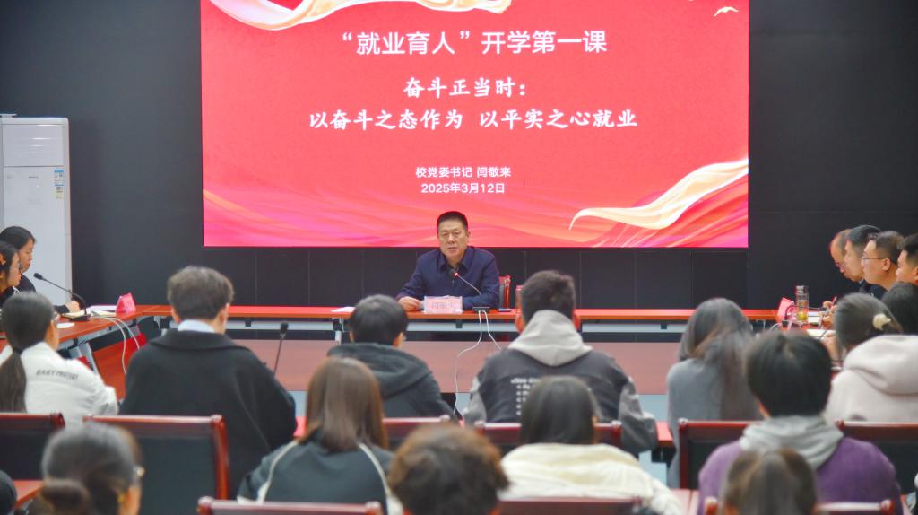 为深入贯彻落实党的二十届三中全会精神和全国教育大会精神,使青年学生及时了解党和国家的方针政策,强化对党的创新理论的学习,引导青年学生树立正确的就业观、择业观,3月12日,校党委书记闫敬来在养正楼九层大会议室以“就业·育人”为主题开展了2025年春季学期“开学第一课”。学生工作部(处)、教务处等部门负责人,辅导员代表、学生代表参加了学习。