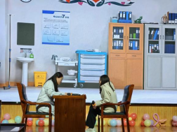 贾伊羽、刘艺、孙思焱三位同学带来的小品《霸总看病》巧妙融入就医场景,“霸总”与医生的互动引得全场大笑。