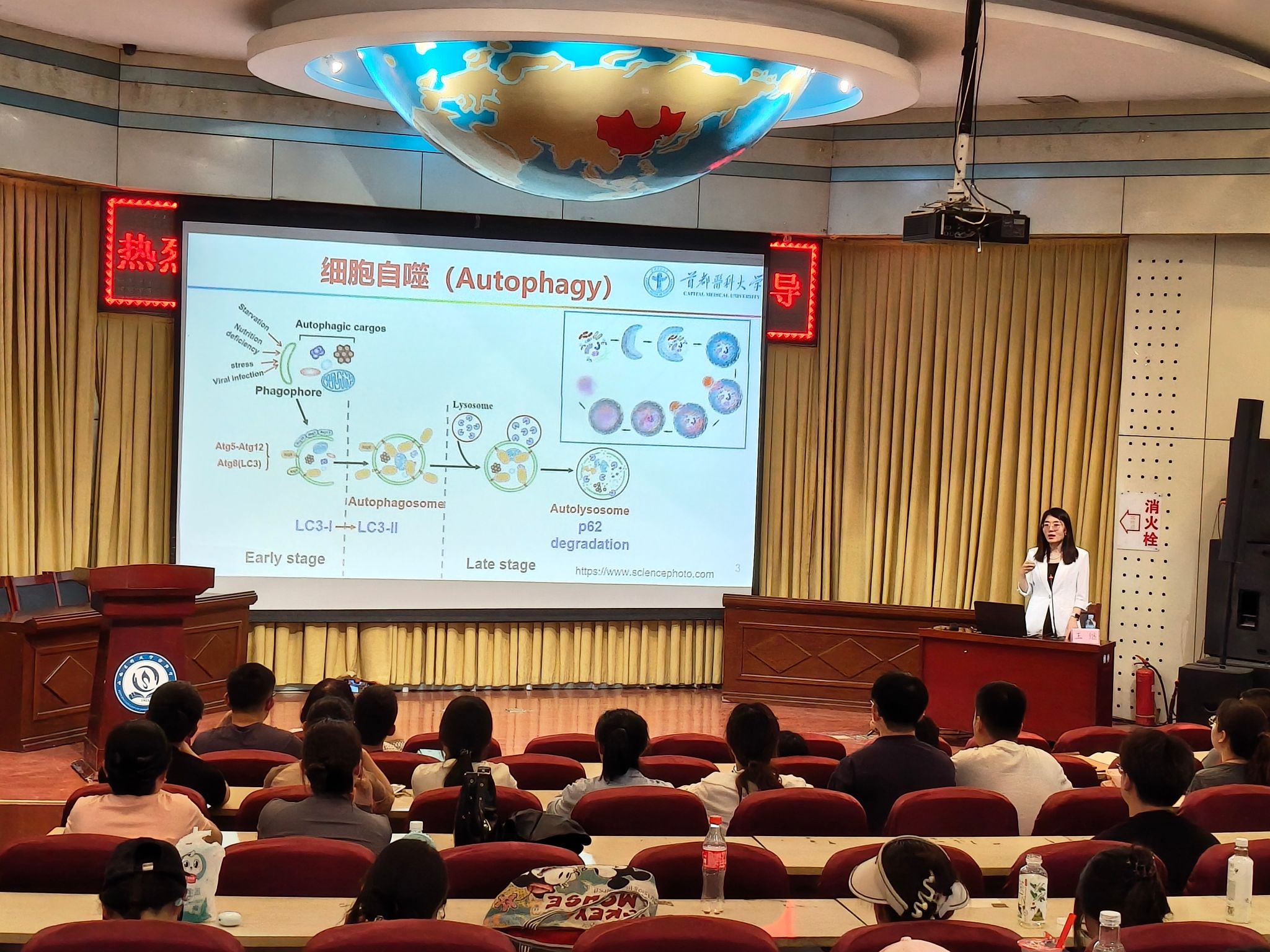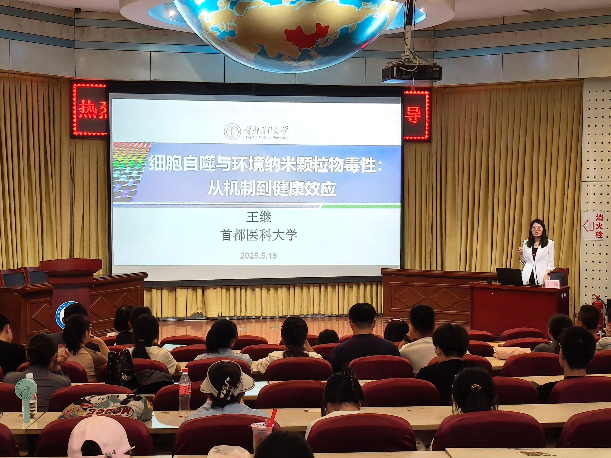 随后,王继老师开启了精彩的讲座。她以塑料污染的全球现状为引,从细胞自噬的基本概念切入,结合生动形象的案例和清晰的示意图,深入浅出地讲解细胞自噬机制。王继老师特别分享了团队在研究中发现的二氧化硅纳米颗粒(SiNPs)如何通过转录因子EB(TFEB)激活分子伴侣HSPB8介导的选择性自噬,以及纳米塑料如何通过AMPK/ULK1通路触发脂肪吞噬、损害溶酶体功能,最终导致肝细胞脂质积累的前沿成果。同时,她还结合肝脏类器官模型的应用,探讨了突破种间差异、精准评估纳米毒性的新路径。在讲解过程中,王继老师分享了科研过程中攻克实验技术难题、突破理论瓶颈的心得体会,让师生们不仅学到了专业知识,更感受到了科研工作者严谨的治学态度和勇于探索的精神。