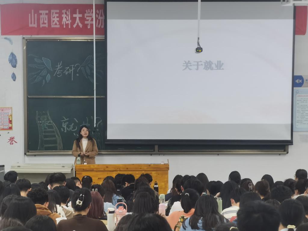 班会开始,赵秀敏老师首先提出问题、罗列数据。根据之前的调查统计显示,72101-8班有考研意向的同学占大多数,有就业、考公、考军队文职等意向的同学占少数比例。赵老师向同学们分享了自己的考研经历,启发大家应该给自己一个正确、客观、真实的评价,进而思考规划未来的重要意义。随后,就“如何获取关于就业方面的信息”这一问题,赵老师采用对比法,分别从国考和军队文职考试两个方面为同学们进行了认真详细的解答。与此同时,赵老师将“山西公考网”、“阳光招考网”、“山西医考信息网”等公众号推荐给大家,以便于帮助同学们后期有效地获取相关信息。
