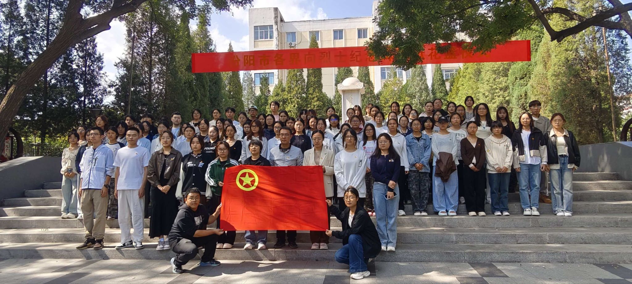 秋日的烈士陵园庄严肃穆,巍然耸立的革命烈士纪念碑在阳光下熠熠生辉。中午12时许,全体师生整齐列队,集体步行至汾阳市烈士陵园。活动在庄严的《中华人民共和国国歌》声中正式开始。随后,现场师生集体肃立,向长眠于此的革命先烈默哀一分钟,表达对英雄的无限哀思与崇高敬意。