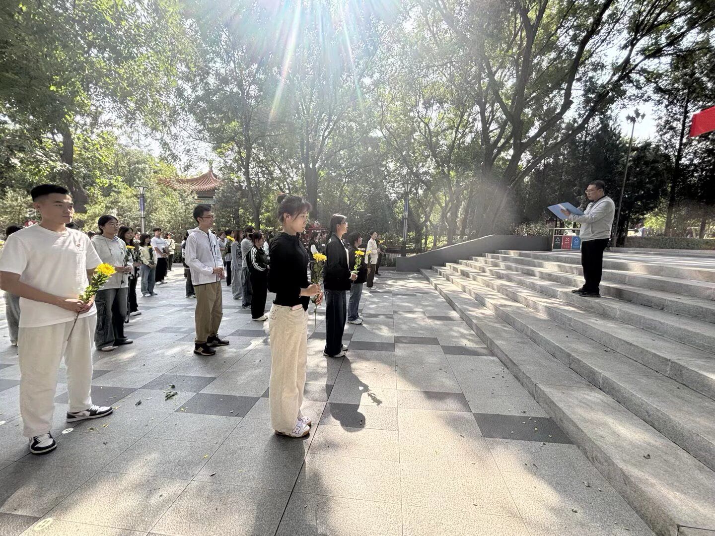 接着,师生手持寄托着哀思与敬意的鲜花,缓步走向烈士纪念碑,依次敬献鲜花并深深鞠躬。一朵朵绽放的菊花,一次次深情的鞠躬,无不凝聚着对革命先烈的深切缅怀和无限景仰。