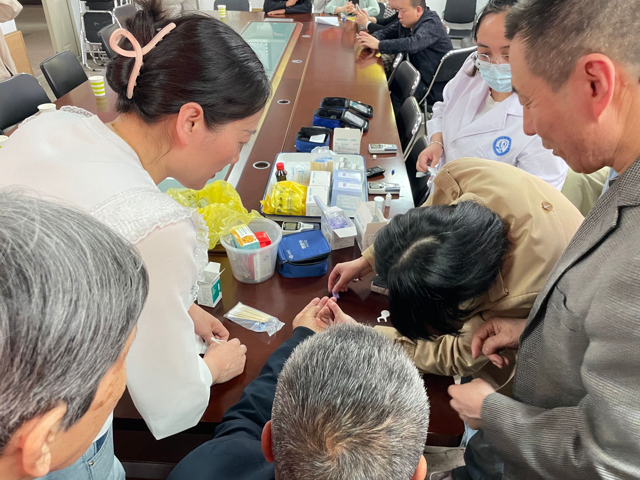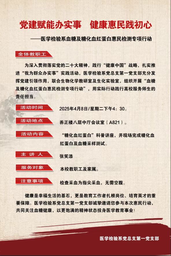 为深入贯彻落实党的二十大精神,践行“健康中国”战略,扎实推进“我为群众办实事”实践活动,医学检验系党总支第一党支部于2025年4月8日下午在养正楼八层中厅会议室(A821)为全校教职工及家属进行了“血糖及糖化血红蛋白惠民检测”。本次活动以“党建赋能办实事,健康惠民践初心”为主题,充分发挥党建引领作用,联合生物化学教研室及生化实验室完成。