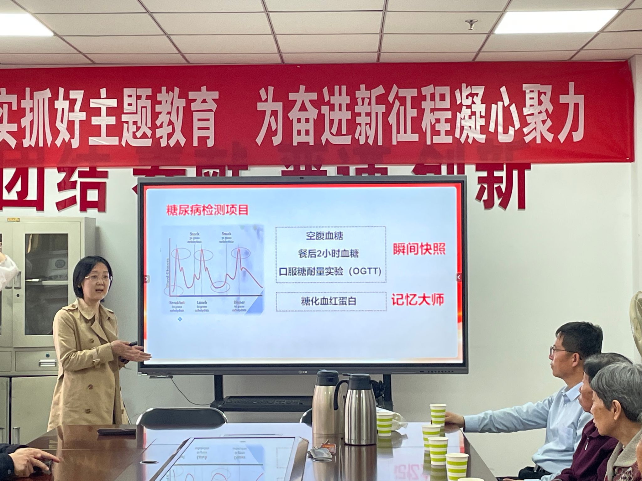 张笑添老师通过深入浅出的讲解,数据分析和案例讲解,帮助参与者全面了解了糖化血红蛋白的重要性及其与糖尿病的关系。讲座内容科学严谨,贴近实际,受到一致好评。活动先后吸引了七十多名教职工及家属的积极参与,现场秩序井然,互动氛围热烈。通过现场检测,为参与者提供了便捷的健康筛查机会,检测结果当场反馈,并对不同检测者提出针对性的意见。许多参与者表示,通过此次活动对自身血糖健康状况有了更清晰的认识,并学到了实用的健康管理知识。